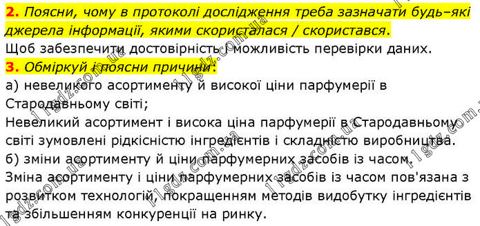 2. Поясни, чому в протоколі дослідження треба зазначати будь–які джерела інформації, якими скористалася / скористався. Щоб забезпечити достовірність і можливість перевірки даних. 3. Обміркуй і поясни причини: а) невеликого асортименту й високої ціни парфумерії в Стародавньому світі; Невеликий асортимент і висока ціна парфумерії в Стародавньому світі зумовлені рідкісністю інгредієнтів і складністю виробництва. б) зміни асортименту й ціни парфумерних засобів із часом. Зміна асортименту і ціни парфумерних засобів із часом пов'язана з розвитком технологій, покращенням методів видобутку інгредієнтів та збільшенням конкуренції на ринку.