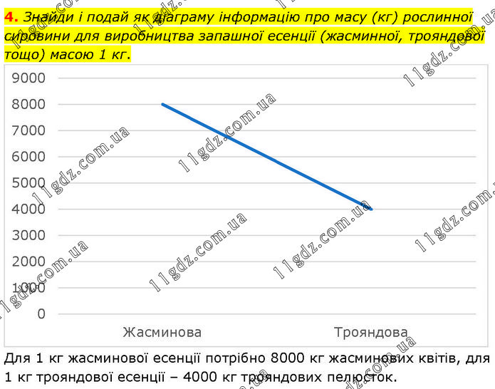 Знайди і подай як діаграму інформацію про масу (кг) рослинної сировини для виробництва запашної есенції (жасминної, трояндової тощо) масою 1 кг. Для 1 кг жасминової есенції потрібно 8000 кг жасминових квітів, для 1 кг трояндової есенції – 4000 кг трояндових пелюсток.