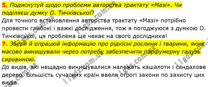 5. Подискутуй щодо проблеми авторства трактату «Мазі». Чи поділяєш думку О. Тичківської? Для точного встановлення авторства трактату «Мазі» потрібно провести глибокі і важкі дослідження, тож я погоджуюся з думкою О. Тичківської, ця проблема ще чекає на свого дослідника! 7. Збери й опрацюй інформацію про рідкісні рослини і тварини, яких масово винищували через потребу забезпечити парфумерну галузь сировиною. До видів, які нещадно винищувалися належать кашалоти і сандалове дерево. Більшість сучасних країн ввели строгі закони по захисту цих видів.
