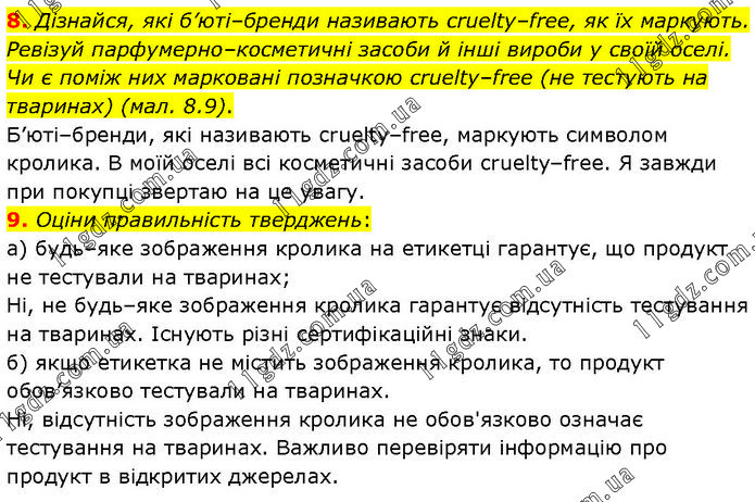 8. Дізнайся, які б’юті–бренди називають cruelty–free, як їх маркують. Ревізуй парфумерно–косметичні засоби й інші вироби у своїй оселі. Чи є поміж них марковані позначкою cruelty–free (не тестують на тваринах) (мал. 8.9). Б’юті–бренди, які називають cruelty–free, маркують символом кролика. В моїй оселі всі косметичні засоби cruelty–free. Я завжди при покупці звертаю на це увагу. 9. Оціни правильність тверджень: а) будь–яке зображення кролика на етикетці гарантує, що продукт не тестували на тваринах; Ні, не будь–яке зображення кролика гарантує відсутність тестування на тваринах. Існують різні сертифікаційні знаки. б) якщо етикетка не містить зображення кролика, то продукт обов’язково тестували на тваринах. Ні, відсутність зображення кролика не обов'язково означає тестування на тваринах. Важливо перевіряти інформацію про продукт в відкритих джерелах.