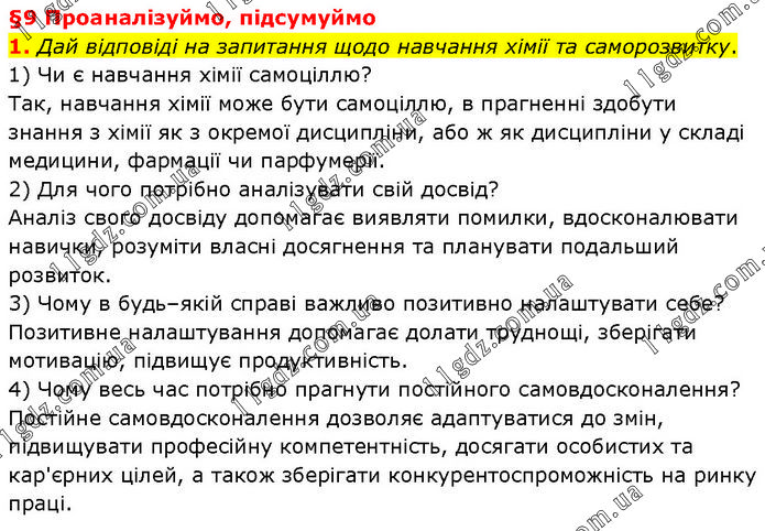 §9 Проаналізуймо, підсумуймо 1. Дай відповіді на запитання щодо навчання хімії та саморозвитку. 1) Чи є навчання хімії самоціллю? Так, навчання хімії може бути самоціллю, в прагненні здобути знання з хімії як з окремої дисципліни, або ж як дисципліни у складі медицини, фармації чи парфумерії. 2) Для чого потрібно аналізувати свій досвід? Аналіз свого досвіду допомагає виявляти помилки, вдосконалювати навички, розуміти власні досягнення та планувати подальший розвиток. 3) Чому в будь–якій справі важливо позитивно налаштувати себе? Позитивне налаштування допомагає долати труднощі, зберігати мотивацію, підвищує продуктивність. 4) Чому весь час потрібно прагнути постійного самовдосконалення? Постійне самовдосконалення дозволяє адаптуватися до змін, підвищувати професійну компетентність, досягати особистих та кар'єрних цілей, а також зберігати конкурентоспроможність на ринку праці.