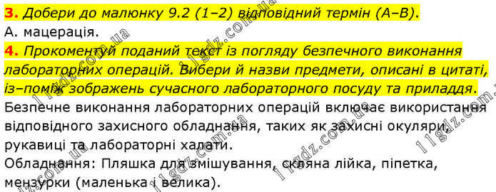 3. Добери до малюнку 9.2 (1–2) відповідний термін (А–В). А. мацерація. 4. Прокоментуй поданий текст із погляду безпечного виконання лабораторних операцій. Вибери й назви предмети, описані в цитаті, із–поміж зображень сучасного лабораторного посуду та приладдя. Безпечне виконання лабораторних операцій включає використання відповідного захисного обладнання, таких як захисні окуляри, рукавиці та лабораторні халати. Обладнання: Пляшка для змішування, скляна лійка, піпетка, мензурки (маленька і велика).