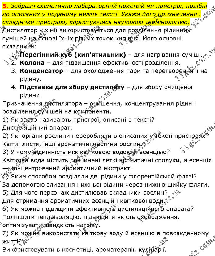 Зобрази схематично лабораторний пристрій чи пристрої, подібні до описаних у поданому нижче тексті. Укажи його призначення і складники пристрою, користуючись науковою термінологією. Дистилятор у хімії використовується для розділення рідинних сумішей на основі їхніх різних точок кипіння. Його основні складники: 1. Перегінний куб (кип'ятильник) – для нагрівання суміші. 2. Колона – для підвищення ефективності розділення. 3. Конденсатор – для охолодження пари та перетворення її на рідину. 4. Підставка для збору дистиляту – для збору очищеної рідини. Призначення дистилятора – очищення, концентрування рідин і розділення сумішей на компоненти. 1) Як зараз називають пристрої, описані в тексті? Дистиляційний апарат. 2) Які органи рослини переробляли в описаних у тексті пристроях? Квіти, листя, інші ароматичні частини рослин. 3) У чому відмінність між квітковою водою й есенцією? Квіткова вода містить розчинені леткі ароматичні сполуки, а есенція — концентрований ароматичний екстракт. 4) Яким способом розділяли дві рідини у флорентійській флязі? За допомогою зливання нижньої рідини через нижню шийку фляги. 5) Для чого персонаж дистилював складники рослин? Для отримання ароматичних есенцій і квіткової води. 6) Як можна підвищити ефективність дистиляційного апарата? Поліпшити теплоізоляцію, підвищити якість охолодження, оптимізувати швидкість нагріву. 7) Як можна використати квіткову воду й есенцію в повсякденному житті? Використовувати в косметиці, ароматерапії, кулінарії.