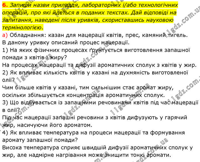 Запиши назви приладдя, лабораторних і/або технологічних операцій, про які йдеться в поданих текстах. Дай відповіді на запитання, наведені після уривків, скориставшись науковою термінологією. а) Обладнання: казан для мацерації квітів, прес, камяний тигель. В даному уривку описаний процес мацерації. 1) На яких фізичних процесах ґрунтується виготовлення запашної помади з квітів і жиру? На процесах мацерації та дифузії ароматичних сполук з квітів у жир. 2) Як впливає кількість квітів у казані на духмяність виготовленої олії? Чим більше квітів у казані, тим сильнішим стає аромат жиру, оскільки збільшується концентрація ароматичних сполук. 3) Що відбувається із запашними речовинами квітів під час мацерації в олії? Під час мацерації запашні речовини з квітів дифузують у гарячий жир, насичуючи його ароматом. 4) Як впливає температура на процеси мацерації та формування аромату запашної помади? Висока температура сприяє швидшій дифузії ароматичних сполук у жир, але надмірне нагрівання може знищити тонкі аромати.