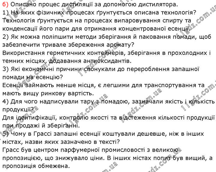 б) Описано процес дистиляції за допомогою дистилятора. 1) На яких фізичних процесах ґрунтується описана технологія? Технологія ґрунтується на процесах випаровування спирту та конденсації його пари для отримання концентрованої есенції. 2) Як можна поліпшити методи зберігання й паковання помади, щоб забезпечити тривале збереження аромату? Використання герметичних контейнерів, зберігання в прохолодних і темних місцях, додавання антиоксидантів. 3) Які економічні причини спонукали до перероблення запашної помади на есенцію? Есенції займають менше місця, є легшими для транспортування та мають вищу ринкову вартість. 4) Для чого надписували тару з помадою, зазначали якість і кількість продукції? Для ідентифікації, контролю якості та відстеження кількості продукції при продажі й зберіганні. 5) Чому в Грассі запашні есенції коштували дешевше, ніж в інших містах, назви яких зазначено в тексті? Грасс був центром парфумерної промисловості з великою пропозицією, що знижувало ціни. В інших містах попит був вищий, а пропозиція обмежена.