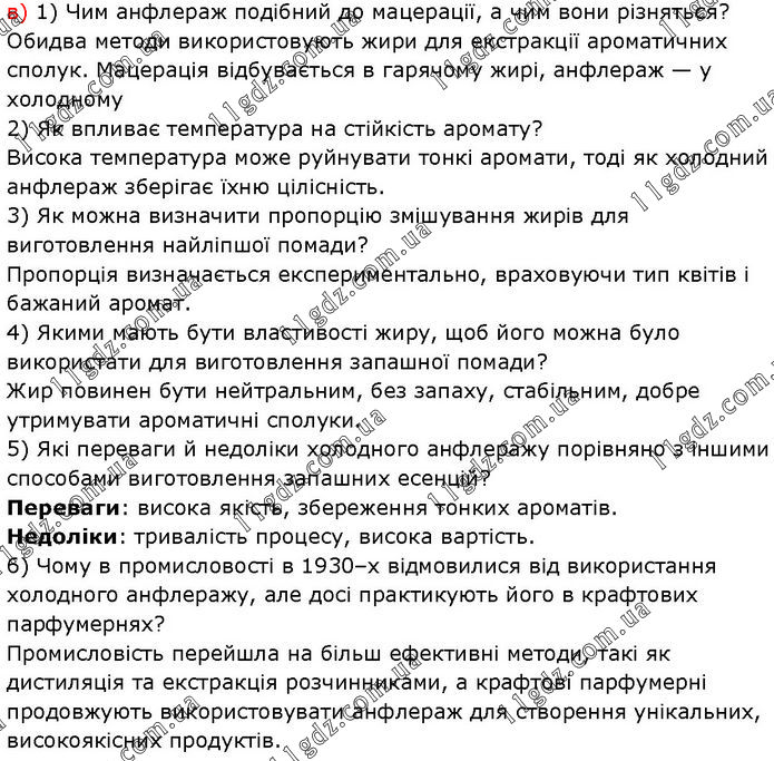 в) 1) Чим анфлераж подібний до мацерації, а чим вони різняться? Обидва методи використовують жири для екстракції ароматичних сполук. Мацерація відбувається в гарячому жирі, анфлераж — у холодному 2) Як впливає температура на стійкість аромату? Висока температура може руйнувати тонкі аромати, тоді як холодний анфлераж зберігає їхню цілісність. 3) Як можна визначити пропорцію змішування жирів для виготовлення найліпшої помади? Пропорція визначається експериментально, враховуючи тип квітів і бажаний аромат. 4) Якими мають бути властивості жиру, щоб його можна було використати для виготовлення запашної помади? Жир повинен бути нейтральним, без запаху, стабільним, добре утримувати ароматичні сполуки. 5) Які переваги й недоліки холодного анфлеражу порівняно з іншими способами виготовлення запашних есенцій? Переваги: висока якість, збереження тонких ароматів. Недоліки: тривалість процесу, висока вартість. 6) Чому в промисловості в 1930–х відмовилися від використання холодного анфлеражу, але досі практикують його в крафтових парфумернях? Промисловість перейшла на більш ефективні методи, такі як дистиляція та екстракція розчинниками, а крафтові парфумерні продовжують використовувати анфлераж для створення унікальних, високоякісних продуктів.