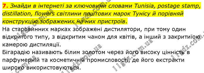 Знайди в інтернеті за ключовими словами Tunisia, postage stamp, distillation, flowers світлини поштових марок Тунісу й порівняй конструкцію зображених на них пристроїв. На старовинних марках зображені дистилятори, при тому один відкритого типу, з відкритим чаном для квітів, а інший з закритиїою камерою дистиляції. Бігарадію називають білим золотом через його високу цінність в парфумерній та косметичній промисловості, де його екстракти широко використовуються.