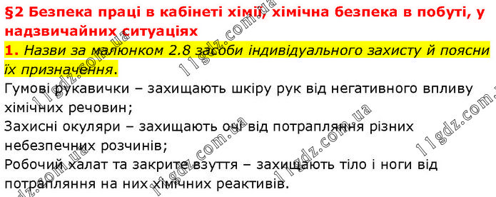 §2 Безпека праці в кабінеті хімії, хімічна безпека в побуті, у надзвичайних ситуаціях 1. Назви за малюнком 2.8 засоби індивідуального захисту й поясни їх призначення. Гумові рукавички – захищають шкіру рук від негативного впливу хімічних речовин; Захисні окуляри – захищають очі від потрапляння різних небезпечних розчинів; Робочий халат та закрите взуття – захищають тіло і ноги від потрапляння на них хімічних реактивів.