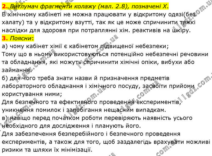 2. Витлумач фрагменти колажу (мал. 2.8), позначені X. В хімічному кабінеті не можна працювати у відкритому одязі(без халату) та у відкритому взутті, так як це може спричинити тяжкі наслідки для здоровя при потраплянні хім. реактивів на шкіру. 3. Поясни: а) чому кабінет хімії є кабінетом підвищеної небезпеки; Тому що в ньому використовуються потенційно небезпечні речовини та обладнання, які можуть спричинити хімічні опіки, вибухи або займання. б) для чого треба знати назви й призначення предметів лабораторного обладнання і хімічного посуду, засвоїти прийоми користування ними; Для безпечного та ефективного проведення експериментів, уникнення помилок і запобігання нещасним випадкам. в) навіщо перед початком роботи перевіряють наявність усього необхідного для дослідження і планують його. Для забезпечення безперебійного і безпечного проведення експериментів, а також для того, щоб заздалегідь врахувати можливі ризики та шляхи їх мінімізації.