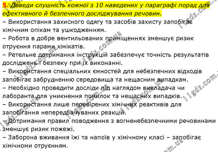 Доведи слушність кожної з 10 наведених у параграфі порад для ефективного й безпечного досліджування речовин. – Використання захисного одягу та засобів захисту запобігає хімічним опікам та ушкодженням. – Робота в добре вентильованих приміщеннях зменшує ризик отруєння парами хімікатів. – Ретельне дотримання інструкцій забезпечує точність результатів досліджень і безпеку при їх виконанні. – Використання спеціальних ємностей для небезпечних відходів запобігає забрудненню середовища та нещасним випадкам. – Необхідно проведити досліди під наглядом викладача чи лаборанта для уникнення помилок та нещасних випадків. – Використання лише перевірених хімічних реактивів для запобігання непередбачуваних реакцій. – Дотримання правил поводження з вогненебезпечними речовинами зменшує ризик пожежі. – Заборона вживання їжі та напоїв у хімічному класі – запобігає хімічноми отруєнням.
