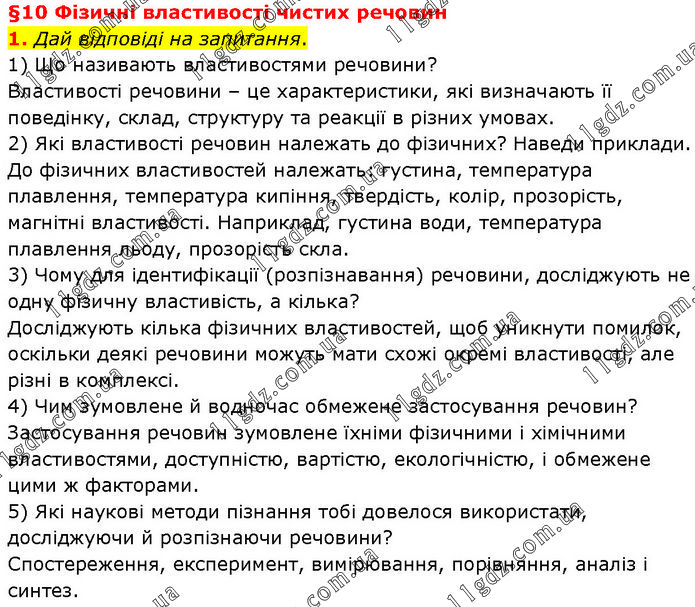 §10 Фізичні властивості чистих речовин 1. Дай відповіді на запитання. 1) Що називають властивостями речовини? Властивості речовини – це характеристики, які визначають її поведінку, склад, структуру та реакції в різних умовах. 2) Які властивості речовин належать до фізичних? Наведи приклади. До фізичних властивостей належать: густина, температура плавлення, температура кипіння, твердість, колір, прозорість, магнітні властивості. Наприклад, густина води, температура плавлення льоду, прозорість скла. 3) Чому для ідентифікації (розпізнавання) речовини, досліджують не одну фізичну властивість, а кілька? Досліджують кілька фізичних властивостей, щоб уникнути помилок, оскільки деякі речовини можуть мати схожі окремі властивості, але різні в комплексі. 4) Чим зумовлене й водночас обмежене застосування речовин? Застосування речовин зумовлене їхніми фізичними і хімічними властивостями, доступністю, вартістю, екологічністю, і обмежене цими ж факторами. 5) Які наукові методи пізнання тобі довелося використати, досліджуючи й розпізнаючи речовини? Спостереження, експеримент, вимірювання, порівняння, аналіз і синтез.