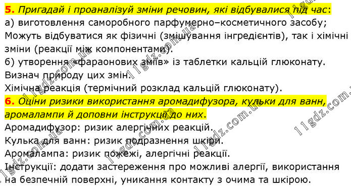 5. Пригадай і проаналізуй зміни речовин, які відбувалися під час: а) виготовлення саморобного парфумерно–косметичного засобу; Можуть відбуватися як фізичні (змішування інгредієнтів), так і хімічні зміни (реакції між компонентами). б) утворення «фараонових зміїв» із таблетки кальцій глюконату. Визнач природу цих змін. Хімічна реакція (термічний розклад кальцій глюконату). 6. Оціни ризики використання аромадифузора, кульки для ванн, аромалампи й доповни інструкції до них. Аромадифузор: ризик алергічних реакцій. Кулька для ванн: ризик подразнення шкіри. Аромалампа: ризик пожежі, алергічні реакції. Інструкції: додати застереження про можливі алергії, використання на безпечній поверхні, уникання контакту з очима та шкірою.