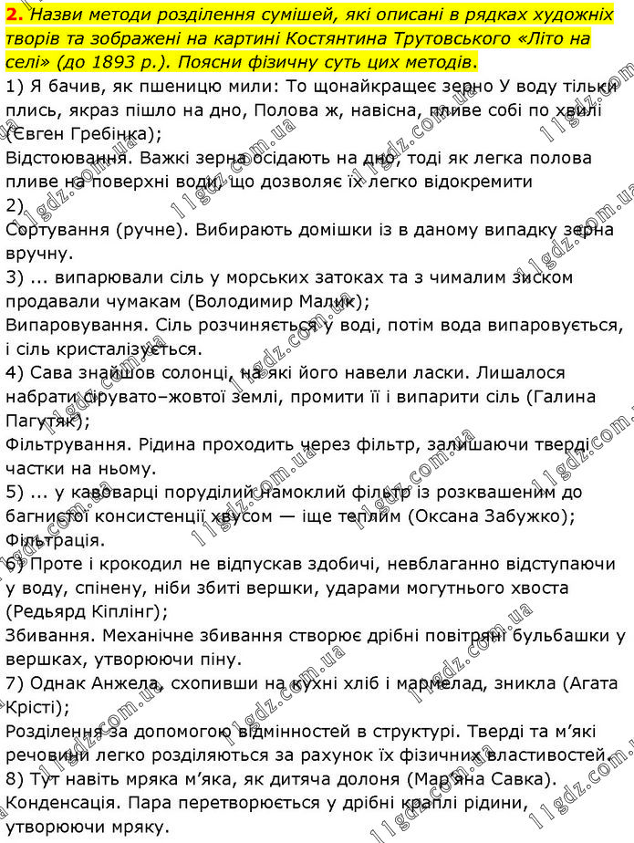 Назви методи розділення сумішей, які описані в рядках художніх творів та зображені на картині Костянтина Трутовського «Літо на селі» (до 1893 р.). Поясни фізичну суть цих методів. 1) Я бачив, як пшеницю мили: То щонайкращеє зерно У воду тільки плись, якраз пішло на дно, Полова ж, навісна, пливе собі по хвилі (Євген Гребінка); Відстоювання. Важкі зерна осідають на дно, тоді як легка полова пливе на поверхні води, що дозволяє їх легко відокремити 2) Сортування (ручне). Вибирають домішки із в даному випадку зерна вручну. 3) ... випарювали сіль у морських затоках та з чималим зиском продавали чумакам (Володимир Малик); Випаровування. Сіль розчиняється у воді, потім вода випаровується, і сіль кристалізується. 4) Сава знайшов солонці, на які його навели ласки. Лишалося набрати сірувато–жовтої землі, промити її і випарити сіль (Галина Пагутяк); Фільтрування. Рідина проходить через фільтр, залишаючи тверді частки на ньому. 5) ... у кавоварці поруділий намоклий фільтр із розквашеним до багнистої консистенції хвусом — іще теплим (Оксана Забужко); Фільтрація. 6) Проте і крокодил не відпускав здобичі, невблаганно відступаючи у воду, спінену, ніби збиті вершки, ударами могутнього хвоста (Редьярд Кіплінг); Збивання. Механічне збивання створює дрібні повітряні бульбашки у вершках, утворюючи піну. 7) Однак Анжела, схопивши на кухні хліб і мармелад, зникла (Агата Крісті); Розділення за допомогою відмінностей в структурі. Тверді та м’які речовини легко розділяються за рахунок їх фізичних властивостей. 8) Тут навіть мряка м’яка, як дитяча долоня (Мар’яна Савка). Конденсація. Пара перетворюється у дрібні краплі рідини, утворюючи мряку.