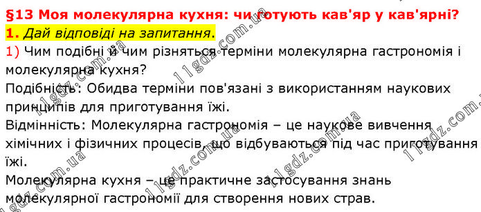 §13 Моя молекулярна кухня: чи готують кав'яр у кав'ярні? 1. Дай відповіді на запитання. 1) Чим подібні й чим різняться терміни молекулярна гастрономія і молекулярна кухня? Подібність: Обидва терміни пов'язані з використанням наукових принципів для приготування їжі. Відмінність: Молекулярна гастрономія – це наукове вивчення хімічних і фізичних процесів, що відбуваються під час приготування їжі. Молекулярна кухня – це практичне застосування знань молекулярної гастрономії для створення нових страв.