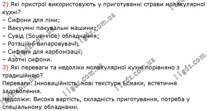 2) Які пристрої використовують у приготуванні страви молекулярної кухні? – Сифони для піни; – Вакуумні пакувальні машини; – Сувід (Sous–vide) обладнання; – Ротаційні випаровувачі; – Сифони для карбонізації; – Азотні сифони. 3) Які переваги та недоліки молекулярної кухні порівняно з традиційною? Переваги: Інноваційність, нові текстури і смаки, естетичне задоволення. Недоліки: Висока вартість, складність приготування, потреба у спеціальному обладнанні.
