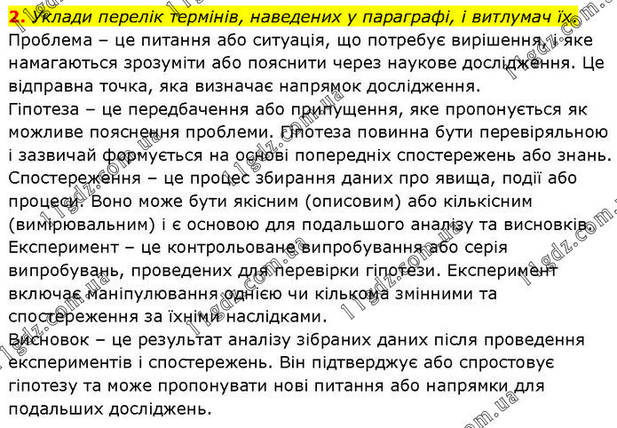 2. Уклади перелік термінів, наведених у параграфі, і витлумач їх. Проблема – це питання або ситуація, що потребує вирішення, і яке намагаються зрозуміти або пояснити через наукове дослідження. Це відправна точка, яка визначає напрямок дослідження. Гіпотеза – це передбачення або припущення, яке пропонується як можливе пояснення проблеми. Гіпотеза повинна бути перевіряльною і зазвичай формується на основі попередніх спостережень або знань. Спостереження – це процес збирання даних про явища, події або процеси. Воно може бути якісним (описовим) або кількісним (вимірювальним) і є основою для подальшого аналізу та висновків. Експеримент – це контрольоване випробування або серія випробувань, проведених для перевірки гіпотези. Експеримент включає маніпулювання однією чи кількома змінними та спостереження за їхніми наслідками. Висновок – це результат аналізу зібраних даних після проведення експериментів і спостережень. Він підтверджує або спростовує гіпотезу та може пропонувати нові питання або напрямки для подальших досліджень.