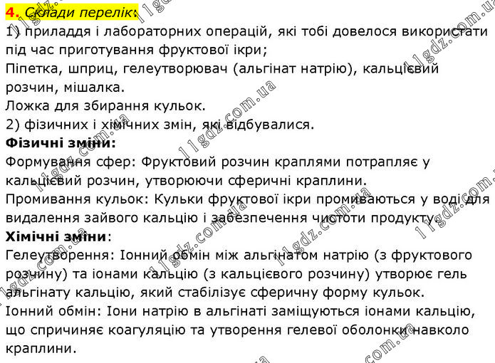 Склади перелік: 1) приладдя і лабораторних операцій, які тобі довелося використати під час приготування фруктової ікри; Піпетка, шприц, гелеутворювач (альгінат натрію), кальцієвий розчин, мішалка. Ложка для збирання кульок. 2) фізичних і хімічних змін, які відбувалися. Фізичні зміни: Формування сфер: Фруктовий розчин краплями потрапляє у кальцієвий розчин, утворюючи сферичні краплини. Промивання кульок: Кульки фруктової ікри промиваються у воді для видалення зайвого кальцію і забезпечення чистоти продукту. Хімічні зміни: Гелеутворення: Іонний обмін між альгінатом натрію (з фруктового розчину) та іонами кальцію (з кальцієвого розчину) утворює гель альгінату кальцію, який стабілізує сферичну форму кульок. Іонний обмін: Іони натрію в альгінаті заміщуються іонами кальцію, що спричиняє коагуляцію та утворення гелевої оболонки навколо краплини.