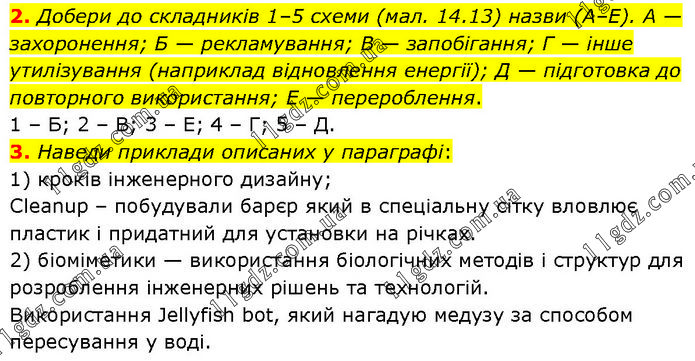 2. Добери до складників 1–5 схеми (мал. 14.13) назви (А–Е). А — захоронення; Б — рекламування; В — запобігання; Г — інше утилізування (наприклад відновлення енергії); Д — підготовка до повторного використання; Е — перероблення. 1 – Б; 2 – В; 3 – Е; 4 – Г; 5 – Д. 3. Наведи приклади описаних у параграфі: 1) кроків інженерного дизайну; Cleanup – побудували барєр який в спеціальну сітку вловлює пластик і придатний для установки на річках. 2) біоміметики — використання біологічних методів і структур для розроблення інженерних рішень та технологій. Використання Jellyfish bot, який нагадую медузу за способом пересування у воді.