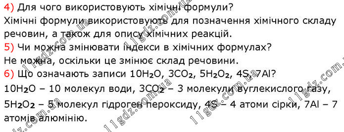 4) Для чого використовують хімічні формули? Хімічні формули використовують для позначення хімічного складу речовин, а також для опису хімічних реакцій. 5) Чи можна змінювати індекси в хімічних формулах? Не можна, оскільки це змінює склад речовини. 6) Що означають записи 10Н2О, 3СО2, 5Н2О2, 4S, 7Аl? 10Н2О – 10 молекул води, 3СО2 – 3 молекули вуглекислого газу, 5Н2О2 – 5 молекул гідроген пероксиду, 4S – 4 атоми сірки, 7Аl – 7 атомів алюмінію.
