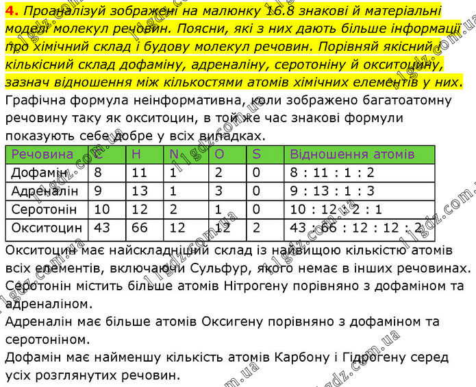 Проаналізуй зображені на малюнку 16.8 знакові й матеріальні моделі молекул речовин. Поясни, які з них дають більше інформації про хімічний склад і будову молекул речовин. Порівняй якісний і кількісний склад дофаміну, адреналіну, серотоніну й окситоцину, зазнач відношення між кількостями атомів хімічних елементів у них. Графічна формула неінформативна, коли зображено багатоатомну речовину таку як окситоцин, в той же час знакові формули показують себе добре у всіх випадках. Речовина C H N O S Відношення атомів Дофамін 8 11 1 2 0 8 : 11 : 1 : 2 Адреналін 9 13 1 3 0 9 : 13 : 1 : 3 Серотонін 10 12 2 1 0 10 : 12 : 2 : 1 Окситоцин 43 66 12 12 2 43 : 66 : 12 : 12 : 2 Окситоцин має найскладніший склад із найвищою кількістю атомів всіх елементів, включаючи Сульфур, якого немає в інших речовинах. Серотонін містить більше атомів Нітрогену порівняно з дофаміном та адреналіном. Адреналін має більше атомів Оксигену порівняно з дофаміном та серотоніном. Дофамін має найменшу кількість атомів Карбону і Гідрогену серед усіх розглянутих речовин.