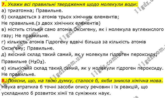 7. Укажи всі правильні твердження щодо молекули води: а) триатомна; Правильне. б) складається з атомів трьох хімічних елементів; Не правильне.(з двох хімічних елементів) в) містить стільки само атомів Оксигену, як і молекула вуглекислого газу; Не правильне. г) кількість атомів Гідрогену вдвічі більша за кількість атомів Оксигену; Правильне. д) якісний склад такий самий, як у молекули гідроген пероксиду; Правильне (Н2О2). е) кількісний склад такий самий, як у молекули гідроген пероксиду. Не правильне. 8. Поясни, що, на твою думку, сталося б, якби зникла хімічна мова. Наука втратила б точні засоби опису речовин і їх реакцій, що ускладнило б розвиток хімії та суміжних наук.