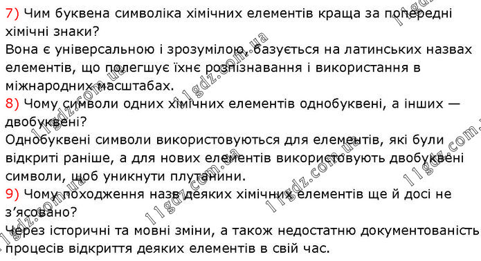 7) Чим буквена символіка хімічних елементів краща за попередні хімічні знаки? Вона є універсальною і зрозумілою, базується на латинських назвах елементів, що полегшує їхнє розпізнавання і використання в міжнародних масштабах. 8) Чому символи одних хімічних елементів однобуквені, а інших — двобуквені? Однобуквені символи використовуються для елементів, які були відкриті раніше, а для нових елементів використовують двобуквені символи, щоб уникнути плутанини. 9) Чому походження назв деяких хімічних елементів ще й досі не з’ясовано? Через історичні та мовні зміни, а також недостатню документованість процесів відкриття деяких елементів в свій час.