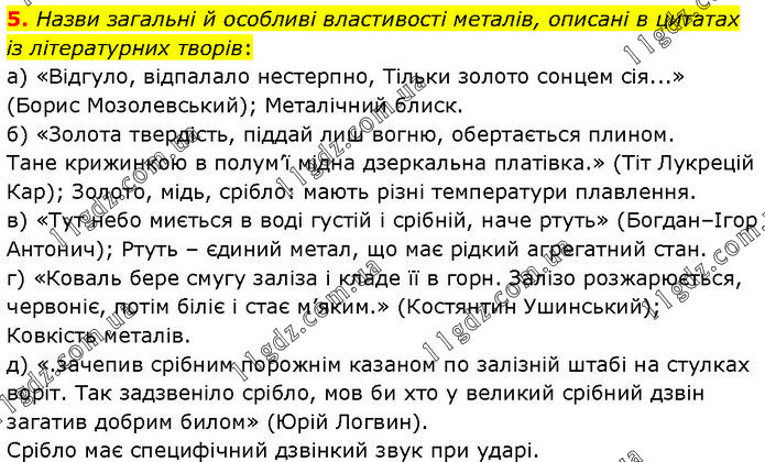Назви загальні й особливі властивості металів, описані в цитатах із літературних творів: а) «Відгуло, відпалало нестерпно, Тільки золото сонцем сія...» (Борис Мозолевський); Металічний блиск. б) «Золота твердість, піддай лиш вогню, обертається плином. Тане крижинкою в полум’ї мідна дзеркальна платівка.» (Тіт Лукрецій Кар); Золото, мідь, срібло: мають різні температури плавлення. в) «Тут небо миється в воді густій і срібній, наче ртуть» (Богдан–Ігор Антонич); Ртуть – єдиний метал, що має рідкий агрегатний стан. г) «Коваль бере смугу заліза і кладе її в горн. Залізо розжарюється, червоніє, потім біліє і стає м’яким.» (Костянтин Ушинський); Ковкість металів. д) «.зачепив срібним порожнім казаном по залізній штабі на стулках воріт. Так задзвеніло срібло, мов би хто у великий срібний дзвін загатив добрим билом» (Юрій Логвин). Срібло має специфічний дзвінкий звук при ударі.