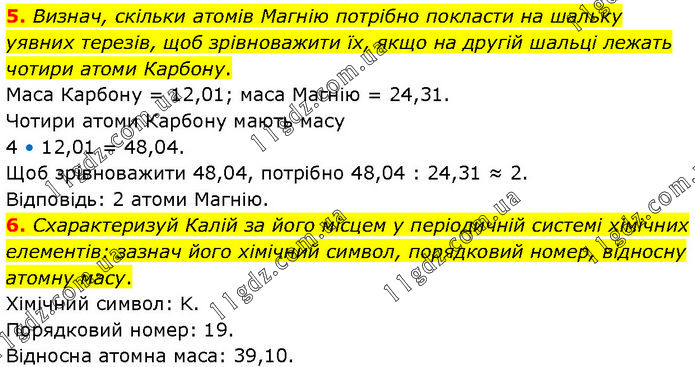 5. Визнач, скільки атомів Магнію потрібно покласти на шальку уявних терезів, щоб зрівноважити їх, якщо на другій шальці лежать чотири атоми Карбону. Маса Карбону = 12,01; маса Магнію = 24,31. Чотири атоми Карбону мають масу 4 • 12,01 = 48,04. Щоб зрівноважити 48,04, потрібно 48,04 : 24,31 ≈ 2. Відповідь: 2 атоми Магнію. 6. Схарактеризуй Калій за його місцем у періодичній системі хімічних елементів: зазнач його хімічний символ, порядковий номер, відносну атомну масу. Хімічний символ: K. Порядковий номер: 19. Відносна атомна маса: 39,10.