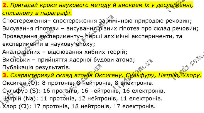 2. Пригадай кроки наукового методу й виокрем їх у дослідженні, описаному в параграфі. Спостереження– спостереження за хімічною природою речовин; Висування гіпотези – висування різних гіпотез про склад речовин; Проведення експерименту– перші алхімічні експерименти, та експерименти в наукову епоху; Аналіз даних – відсіювання хибних теорій; Висновки – прийняття ядерної будови атома; Публікація результатів. 3. Схарактеризуй склад атомів Оксигену, Сульфуру, Натрію, Хлору. Оксиген (O): 8 протонів, 8 нейтронів, 8 електронів. Сульфур (S): 16 протонів, 16 нейтронів, 16 електронів. Натрій (Na): 11 протонів, 12 нейтронів, 11 електронів. Хлор (Cl): 17 протонів, 18 нейтронів, 17 електронів.
