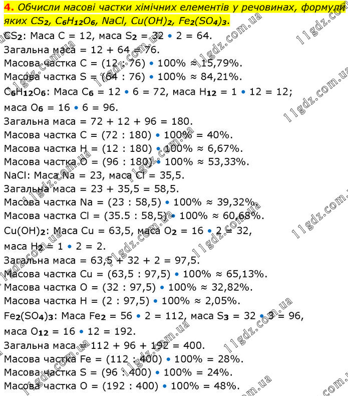 Обчисли масові частки хімічних елементів у речовинах, формули яких CS2, C6H12O6, NaCl, Cu(OH)2, Fe2(SO4)3. CS2: Маса C = 12, маса S2 = 32 • 2 = 64. Загальна маса = 12 + 64 = 76. Масова частка C = (12 : 76) • 100% ≈ 15,79%. Масова частка S = (64 : 76) • 100% ≈ 84,21%. C6H12O6: Маса C6 = 12 • 6 = 72, маса H12 = 1 • 12 = 12; маса O6 = 16 • 6 = 96. Загальна маса = 72 + 12 + 96 = 180. Масова частка C = (72 : 180) • 100% = 40%. Масова частка H = (12 : 180) • 100% ≈ 6,67%. Масова частка O = (96 : 180) • 100% ≈ 53,33%. NaCl: Маса Na = 23, маса Cl = 35,5. Загальна маса = 23 + 35,5 = 58,5. Масова частка Na = (23 : 58,5) • 100% ≈ 39,32%. Масова частка Cl = (35.5 : 58,5) • 100% ≈ 60,68%. Cu(OH)2: Маса Cu = 63,5, маса O2 = 16 • 2 = 32, маса H2 = 1 • 2 = 2. Загальна маса = 63,5 + 32 + 2 = 97,5. Масова частка Cu = (63,5 : 97,5) • 100% ≈ 65,13%. Масова частка O = (32 : 97,5) • 100% ≈ 32,82%. Масова частка H = (2 : 97,5) • 100% ≈ 2,05%. Fe2(SO4)3: Маса Fe2 = 56 • 2 = 112, маса S3 = 32 • 3 = 96, маса O12 = 16 • 12 = 192. Загальна маса = 112 + 96 + 192 = 400. Масова частка Fe = (112 : 400) • 100% = 28%. Масова частка S = (96 : 400) • 100% = 24%. Масова частка O = (192 : 400) • 100% = 48%.