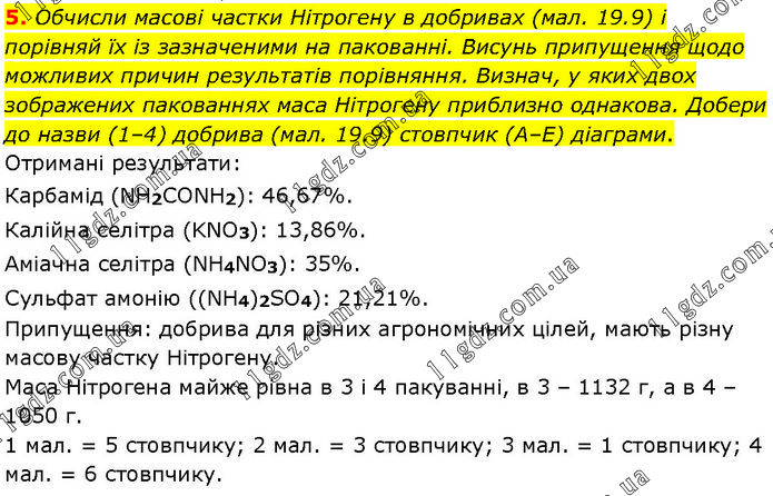 Обчисли масові частки Нітрогену в добривах (мал. 19.9) і порівняй їх із зазначеними на пакованні. Висунь припущення щодо можливих причин результатів порівняння. Визнач, у яких двох зображених пакованнях маса Нітрогену приблизно однакова. Добери до назви (1–4) добрива (мал. 19.9) стовпчик (А–Е) діаграми. Отримані результати: Карбамід (NH2CONH2): 46,67%. Калійна селітра (KNO3): 13,86%. Аміачна селітра (NH4NO3): 35%. Сульфат амонію ((NH4)2SO4): 21,21%. Припущення: добрива для різних агрономічних цілей, мають різну масову частку Нітрогену. Маса Нітрогена майже рівна в 3 і 4 пакуванні, в 3 – 1132 г, а в 4 –1050 г. 1 мал. = 5 стовпчику; 2 мал. = 3 стовпчику; 3 мал. = 1 стовпчику; 4 мал. = 6 стовпчику.
