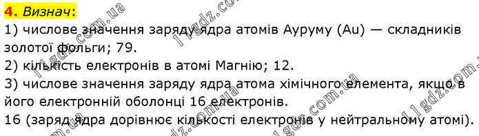 Визнач: 1) числове значення заряду ядра атомів Ауруму (Au) — складників золотої фольги; 79. 2) кількість електронів в атомі Магнію; 12. 3) числове значення заряду ядра атома хімічного елемента, якщо в його електронній оболонці 16 електронів. 16 (заряд ядра дорівнює кількості електронів у нейтральному атомі).
