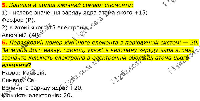 5. Запиши й вимов хімічний символ елемента: 1) числове значення заряду ядра атома якого +15; Фосфор (P). 2) в атомі якого 13 електронів. Алюміній (Al). 6. Порядковий номер хімічного елемента в періодичній системі — 20. Запишіть його назву, символ, укажіть величину заряду ядра атома, зазначте кількість електронів в електронній оболонці атома цього елемента? Назва: Кальцій. Символ: Ca. Величина заряду ядра: +20. Кількість електронів: 20.