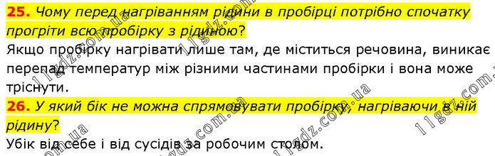 25. Чому перед нагріванням рідини в пробірці потрібно спочатку прогріти всю пробірку з рідиною? Якщо пробірку нагрівати лише там, де міститься речовина, виникає перепад температур між різними частинами пробірки і вона може тріснути. 26. У який бік не можна спрямовувати пробірку, нагріваючи в ній рідину? Убік від себе і від сусідів за робочим столом.