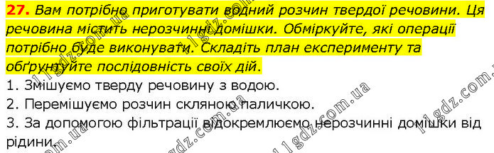 Вам потрібно приготувати водний розчин твердої речовини. Ця речовина містить нерозчинні домішки. Обміркуйте, які операції потрібно буде виконувати. Складіть план експерименту та обґрунтуйте послідовність своїх дій. 1. Змішуємо тверду речовину з водою. 2. Перемішуємо розчин скляною паличкою. 3. За допомогою фільтрації відокремлюємо нерозчинні домішки від рідини.