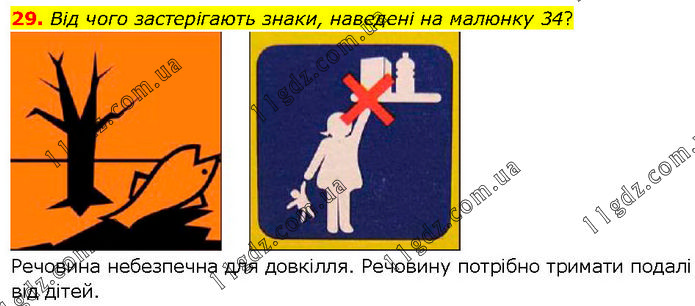 Від чого застерігають знаки, наведені на малюнку 34? Речовина небезпечна для довкілля. Речовину потрібно тримати подалі від дітей.