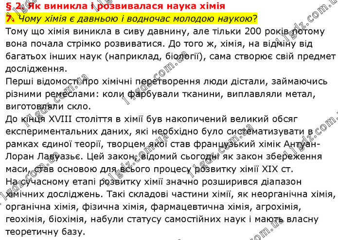 § 2. Як виникла і розвивалася наука хімія 7. Чому хімія є давньою і водночас молодою наукою? Тому що хімія виникла в сиву давнину, але тільки 200 років потому вона почала стрімко розвиватися. До того ж, хімія, на відміну від багатьох інших наук (наприклад, біології), сама створює свій предмет дослідження. Перші відомості про хімічні перетворення люди дістали, займаючись різними ремеслами: коли фарбували тканини, виплавляли метал, виготовляли скло. До кінця XVIII століття в хімії був накопичений великий обсяг експериментальних даних, які необхідно було систематизувати в рамках єдиної теорії, творцем якої став французький хімік Антуан-Лоран Лавуазьє. Цей закон, відомий сьогодні як закон збереження маси, став основою для всього процесу розвитку хімії XIX ст. На сучасному етапі розвитку хімії значно розширився діапазон хімічних досліджень. Такі складові частини хімії, як неорганічна хімія, органічна хімія, фізична хімія, фармацевтична хімія, агрохімія, геохімія, біохімія, набули статусу самостійних наук і мають власну теоретичну базу.