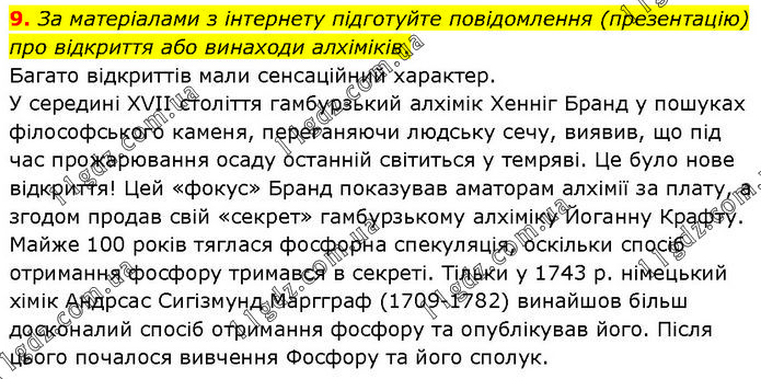 За матеріалами з інтернету підготуйте повідомлення (презентацію) про відкриття або винаходи алхіміків. Багато відкриттів мали сенсаційний характер. У середині ХVII століття гамбурзький алхімік Хенніг Бранд у пошуках філософського каменя, переганяючи людську сечу, виявив, що під час прожарювання осаду останній світиться у темряві. Це було нове відкриття! Цей «фокус» Бранд показував аматорам алхімії за плату, а згодом продав свій «секрет» гамбурзькому алхіміку Йоганну Крафту. Майже 100 років тяглася фосфорна спекуляція, оскільки спосіб отримання фосфору тримався в секреті. Тільки у 1743 р. німецький хімік Андрсас Сигізмунд Маргграф (1709-1782) винайшов більш досконалий спосіб отримання фосфору та опублікував його. Після цього почалося вивчення Фосфору та його сполук.