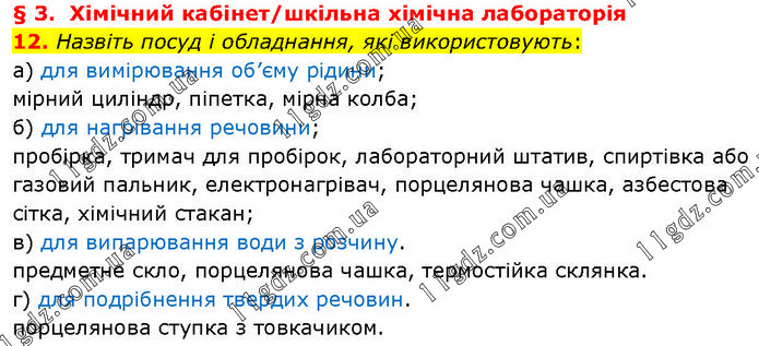 § 3. Хімічний кабінет/шкільна хімічна лабораторія 12. Назвіть посуд і обладнання, які використовують: а) для вимірювання об’єму рідини; мірний циліндр, піпетка, мірна колба; б) для нагрівання речовини; пробірка, тримач для пробірок, лабораторний штатив, спиртівка або газовий пальник, електронагрівач, порцелянова чашка, азбестова сітка, хімічний стакан; в) для випарювання води з розчину. предметне скло, порцелянова чашка, термостійка склянка. г) для подрібнення твердих речовин. порцелянова ступка з товкачиком.