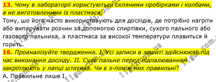 13. Чому в лабораторії користуються скляними пробірками і колбами, а не виготовленими із пластмаси. Тому, шо його часто використовують для дослідів, де потрібно нагріти або випарувати розчин за допомогою спиртівки, сухого пального або газового пальника, а пластмаса за високої температури плавиться й горить. 16. Проаналізуйте твердження. І. Усі записи в зошиті здійснюють під час виконання досліду. ІІ. Сухе пальне перед підпалюванням закріплюють у лапці штатива. Чи є з-поміж них правильні? А. Правильне лише І.