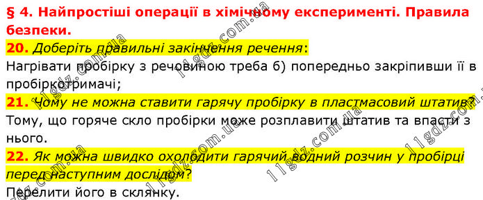 § 4. Найпростіші операції в хімічному експерименті. Правила безпеки. 20. Доберіть правильні закінчення речення: Нагрівати пробірку з речовиною треба б) попередньо закріпивши її в пробіркотримачі; 21. Чому не можна ставити гарячу пробірку в пластмасовий штатив? Тому, що горяче скло пробірки може розплавити штатив та впасти з нього. 22. Як можна швидко охолодити гарячий водний розчин у пробірці перед наступним дослідом? Перелити його в склянку.