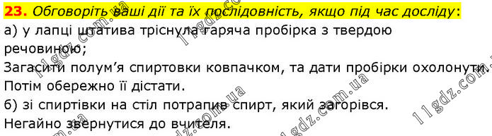 Обговоріть ваші дії та їх послідовність, якщо під час досліду: а) у лапці штатива тріснула гаряча пробірка з твердою речовиною; Загасити полум’я спиртовки ковпачком, та дати пробірки охолонути. Потім обережно її дістати. б) зі спиртівки на стіл потрапив спирт, який загорівся. Негайно звернутися до вчителя.