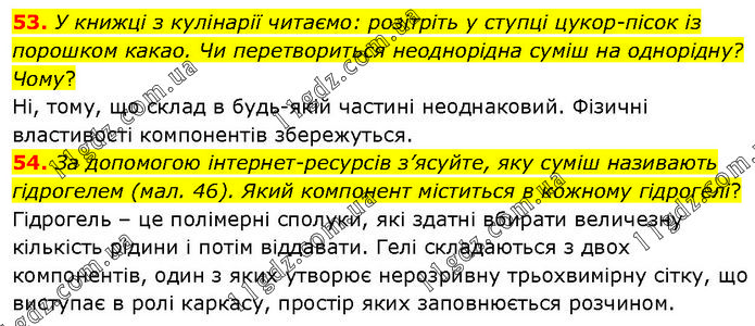 53. У книжці з кулінарії читаємо: розітріть у ступці цукор-пісок із порошком какао. Чи перетвориться неоднорідна суміш на однорідну? Чому? Ні, тому, що склад в будь-якій частині неоднаковий. Фізичні властивості компонентів збережуться. 54. За допомогою інтернет-ресурсів з’ясуйте, яку суміш називають гідрогелем (мал. 46). Який компонент міститься в кожному гідрогелі? Гідрогель – це полімерні сполуки, які здатні вбирати величезну кількість рідини і потім віддавати. Гелі складаються з двох компонентів, один з яких утворює нерозривну трьохвимірну сітку, що виступає в ролі каркасу, простір яких заповнюється розчином.
