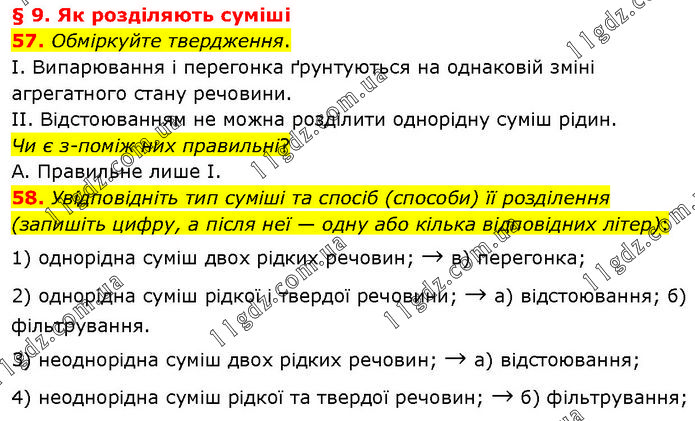 § 9. Як розділяють суміші 57. Обміркуйте твердження. І. Випарювання і перегонка ґрунтуються на однаковій зміні агрегатного стану речовини. ІІ. Відстоюванням не можна розділити однорідну суміш рідин. Чи є з-поміж них правильні? А. Правильне лише І. 58. Увідповідніть тип суміші та спосіб (способи) її розділення (запишіть цифру, а після неї — одну або кілька відповідних літер): 1) однорідна суміш двох рідких речовин; → в) перегонка; 2) однорідна суміш рідкої і твердої речовини; → а) відстоювання; б) фільтрування. 3) неоднорідна суміш двох рідких речовин; → а) відстоювання; 4) неоднорідна суміш рідкої та твердої речовин; → б) фільтрування;