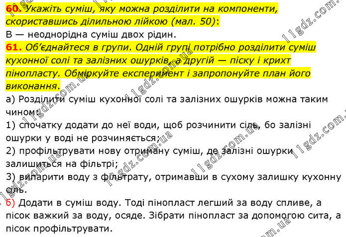 60. Укажіть суміш, яку можна розділити на компоненти, скориставшись ділильною лійкою (мал. 50): В — неоднорідна суміш двох рідин. 61. Об’єднайтеся в групи. Одній групі потрібно розділити суміш кухонної солі та залізних ошурків, а другій — піску і крихт пінопласту. Обміркуйте експеримент і запропонуйте план його виконання. а) Розділити суміш кухонної солі та залізних ошурків можна таким чином: 1) спочатку додати до неї води, щоб розчинити сіль, бо залізні ошурки у воді не розчиняється; 2) профільтрувати нову отриману суміш, де залізні ошурки залишиться на фільтрі; 3) випарити воду з фільтрату, отримавши в сухому залишку кухонну сіль. б) Додати в суміш воду. Тоді пінопласт легший за воду спливе, а пісок важкий за воду, осяде. Зібрати пінопласт за допомогою сита, а пісок профільтрувати.