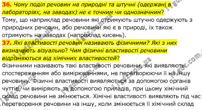 36. Чому поділ речовин на природні та штучні (одержані в лабораторіях, на заводах) не є точним чи однозначним? Тому, що наприклад речовини які отримують штучно одержують з природних речовин, або речовини які є в природі, їх також отримують на заводах (наприклад кисень). 37. Які властивості речовин називають фізичними? Які з них визначають візуально? Чим фізичні властивості речовини відрізняються від хімічних властивостей? Фізичними називають такі властивості речовини, які виявляють спостереженням або вимірюваннями, не перетворюючи її на іншу речовину. Фізичні властивості виявляються за допомогою органів чуттів, чи виміряють за допомогою приладів, при цьому хімічний склад речовини не змінюється. Хімічні властивості виявляють під час перетворення речовини на іншу, коли змінюється її хімічний склад