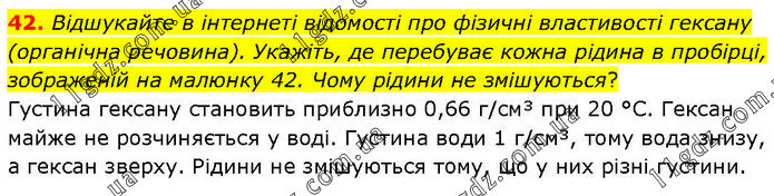 Відшукайте в інтернеті відомості про фізичні властивості гексану (органічна речовина). Укажіть, де перебуває кожна рідина в пробірці, зображеній на малюнку 42. Чому рідини не змішуються? Густина гексану становить приблизно 0,66 г/см³ при 20 °C. Гексан майже не розчиняється у воді. Густина води 1 г/см³, тому вода знизу, а гексан зверху. Рідини не змішуються тому, що у них різні густини.