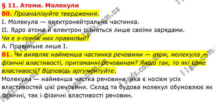 § 11. Атоми. Молекули 80. Проаналізуйте твердження. І. Молекула — електронейтральна частинка. ІІ. Ядро атома й електрон різняться лише своїми зарядами. Чи є з-поміж них правильні? А. Правильне лише І. 81. Чи виявляє найменша частинка речовини — атом, молекула — фізичні властивості, притаманні речовинам? Якщо так, то які саме властивості? Відповідь аргументуйте. Молекула — найменша частка речовини, яка є носієм усіх властивостей цієї речовини. Склад та будова молекул обумовлює як фізичні, так і фізичні властивості речовин.