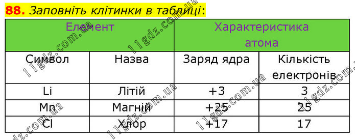 Заповніть клітинки в таблиці: Елемент Характеристика атома Символ Назва Заряд ядра Кількість електронів Li Літій +3 3 Mn Магній +25 25 Cl Хлор +17 17