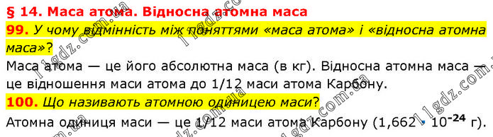 § 14. Маса атома. Відносна атомна маса 99. У чому відмінність між поняттями «маса атома» і «відносна атомна маса»? Маса атома — це його абсолютна маса (в кг). Відносна атомна маса — це відношення маси атома до 1/12 маси атома Карбону. 100. Що називають атомною одиницею маси? Атомна одиниця маси — це 1/12 маси атома Карбону (1,662 ∙ 10-24 г).